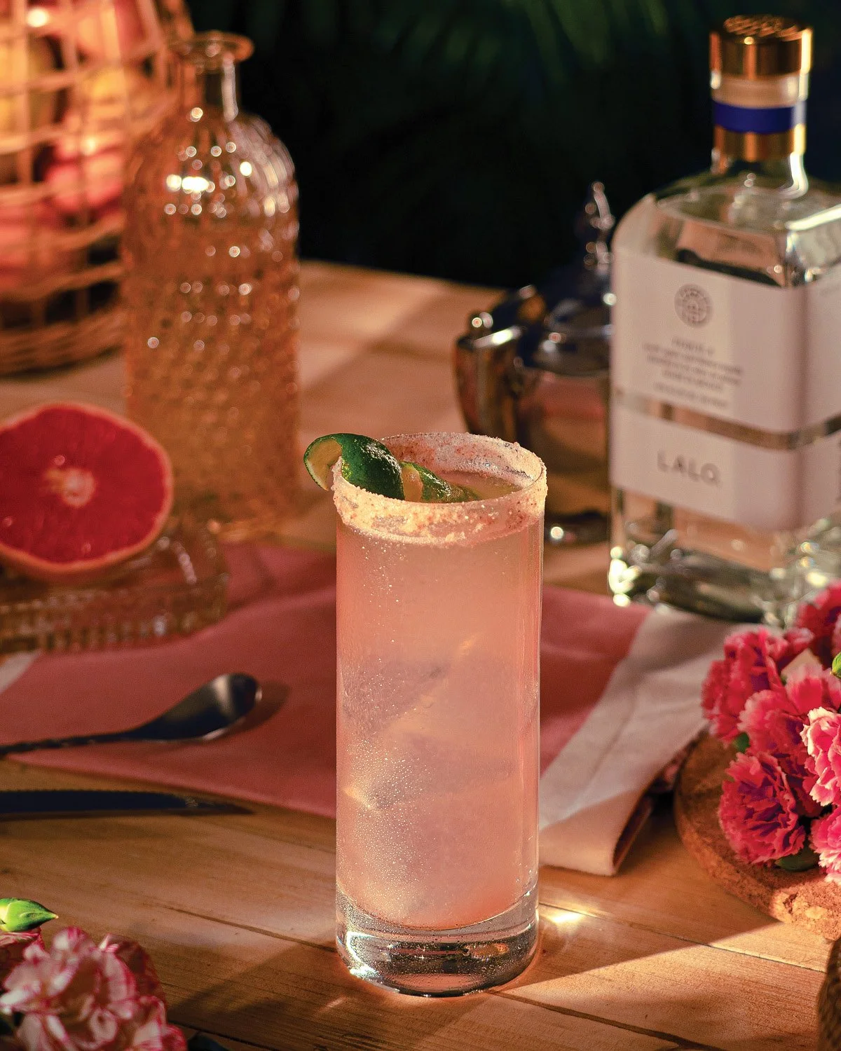 Add LALO, fresh juices, agave syrup, and a pinch of salt to an ice-filled shaker tin. Shake and strain into a salt-rimmed, ice-filled collins glass. Top with sparkling water, and garnish with a lime wheel or wedge.